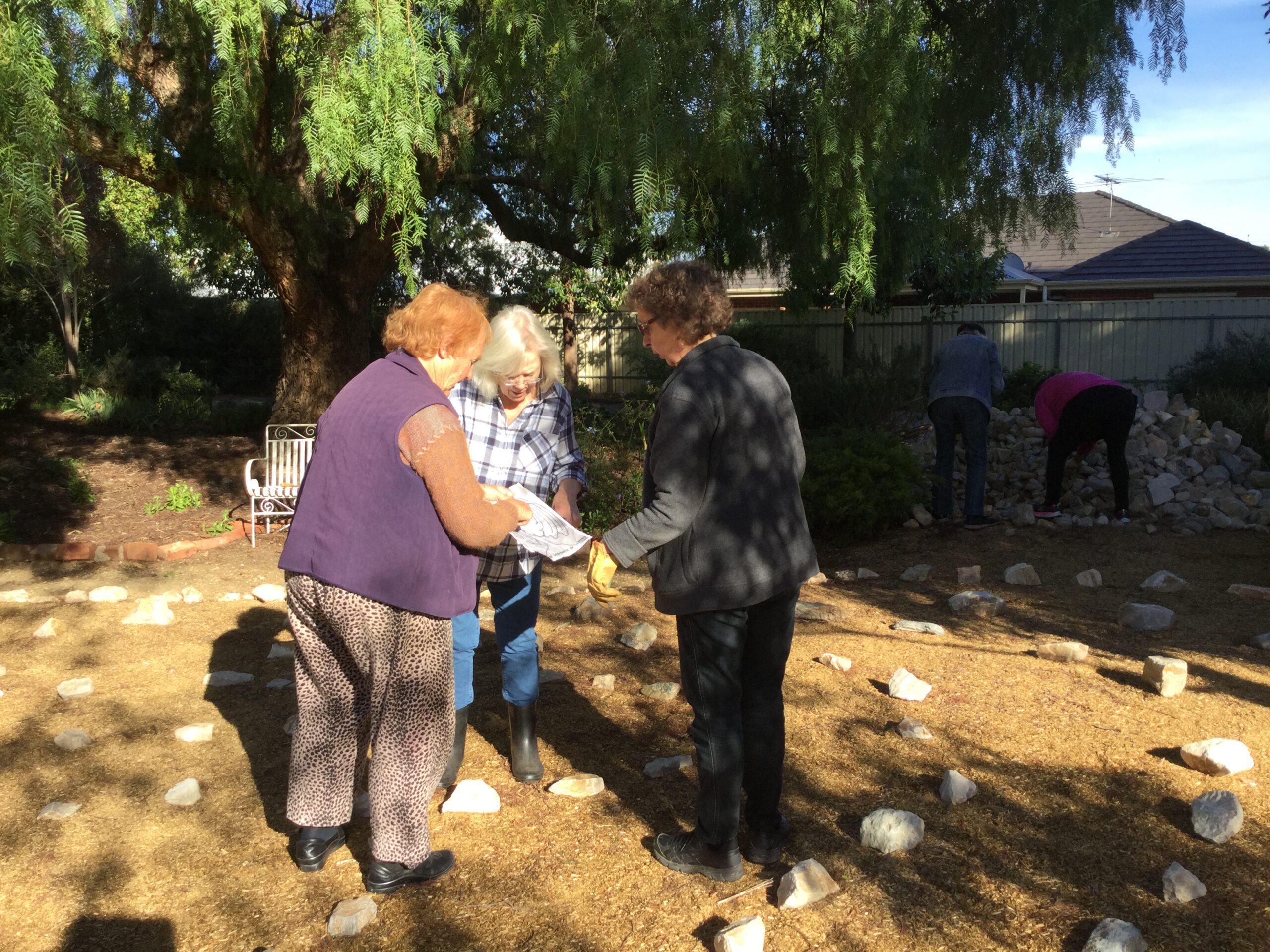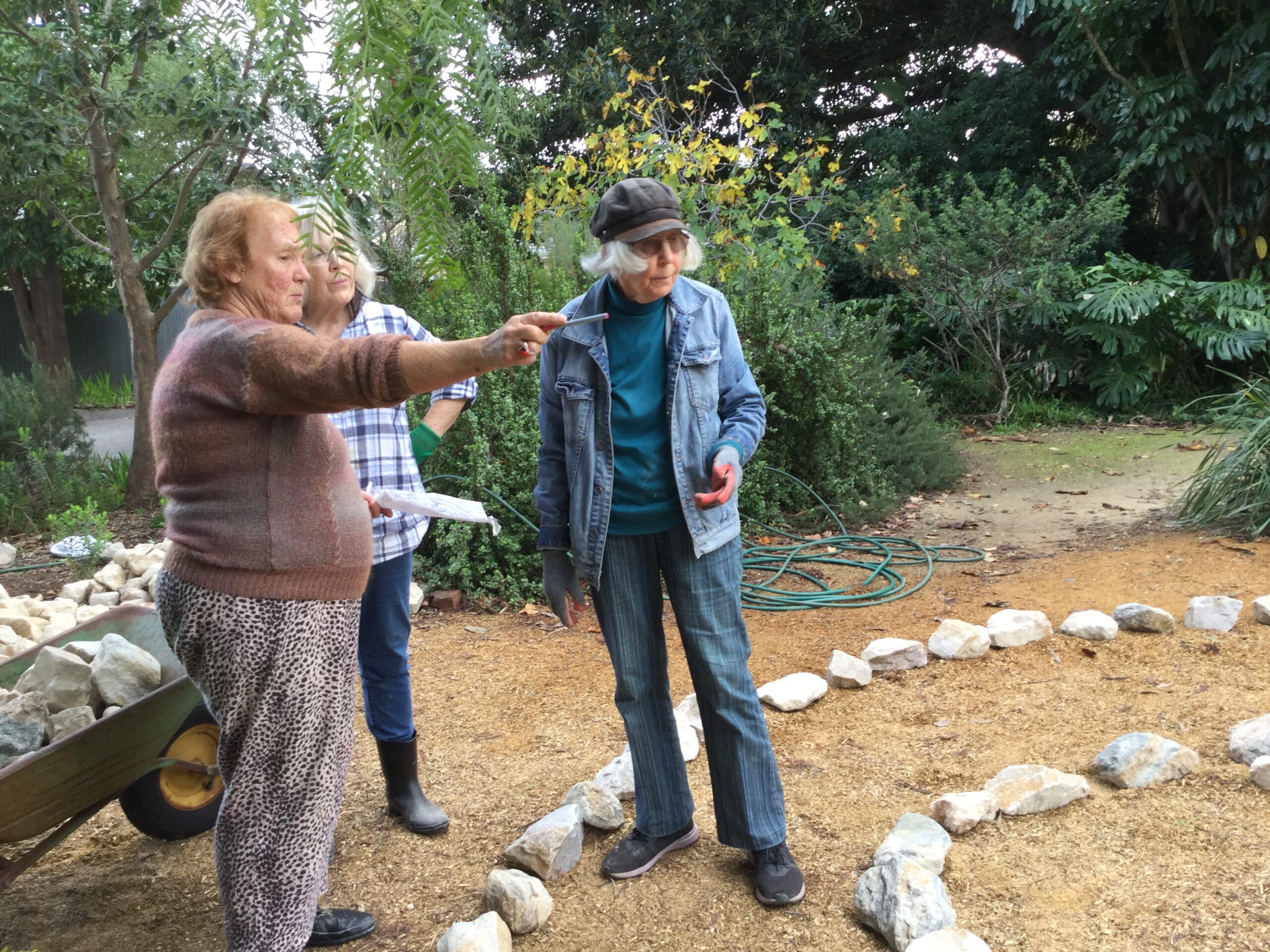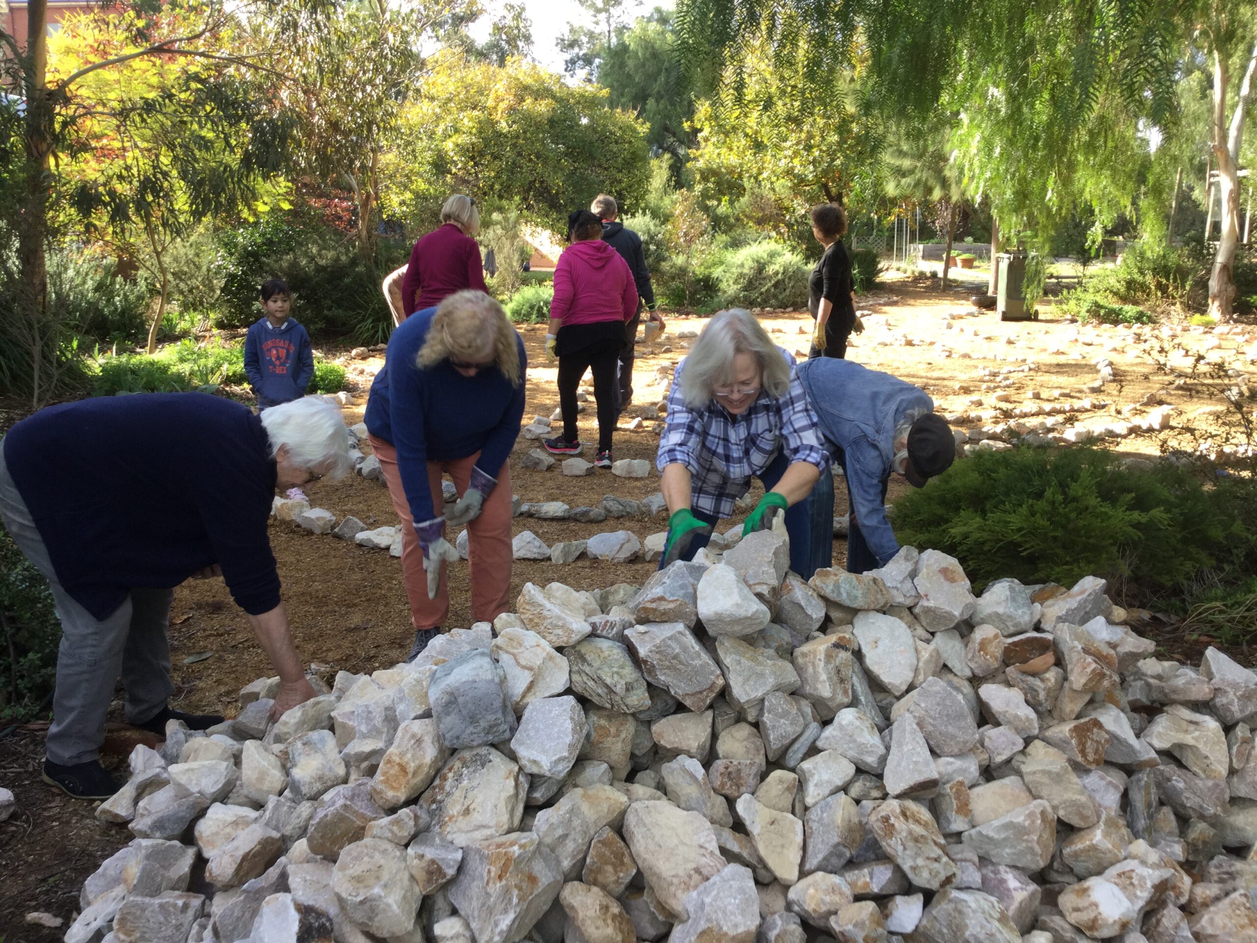 Thanks to volunteers, laying out begins from the mountain of rocks eventually sourced by Catherine and Sophia.